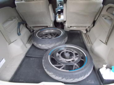 | 車に積み込んで、出発の準備。 | 前後のタイヤが無い状態。怖い。 | |